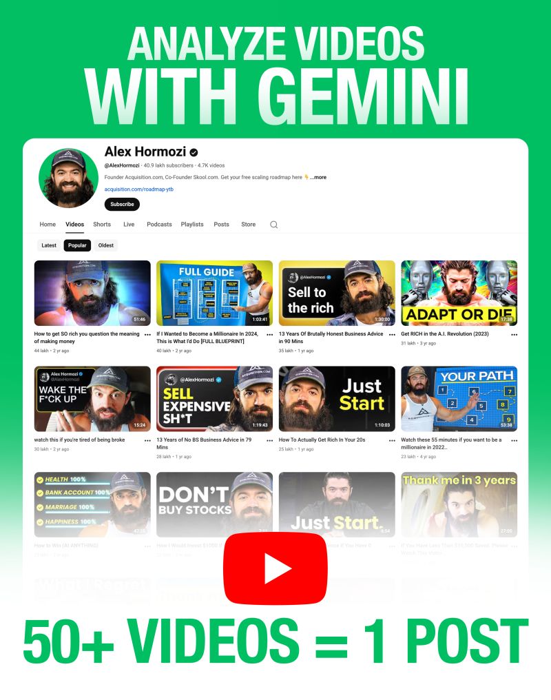 To understand Alex Hormozi’s channel, you must understand its ultimate purpose. He is not a “YouTuber” in the traditional sense; he does not rely on AdSense, brand deals, or selling $997 courses.